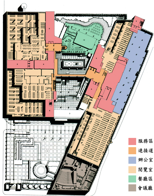 master floor plan 分為主要的兩區,中間主要作服務(餐廳、展示)與連接(走道)兩量體的功用