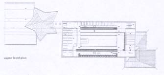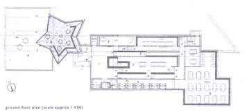 粉紅箭頭:主入口 淺橘色塊:圖書展示處 淺紫色塊:夾層(閱覽) 淺黃色塊:閱覽室 綠色塊:兒童圖書室 藍色塊:室外庭院 淺綠色塊:辦公室 紫紅色塊:小型表演室 淺藍色塊:讀書間 ----------------網路室