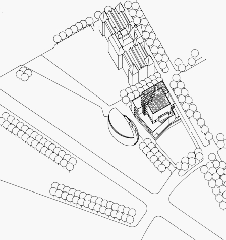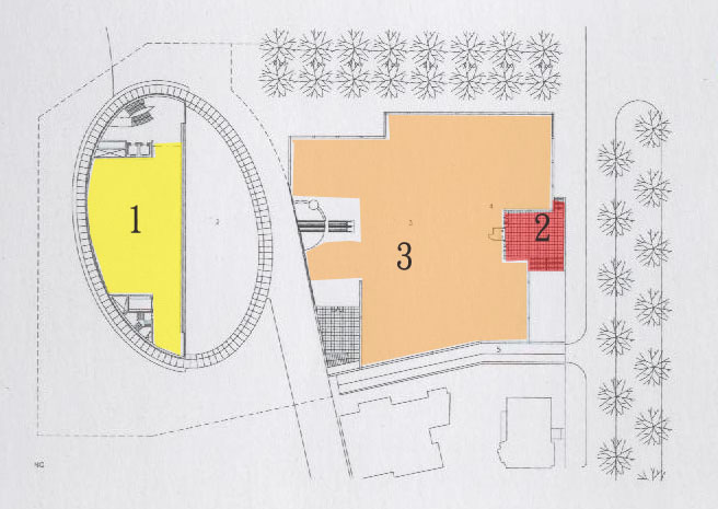 1.展示室(翼館) 2.美術館入口 3.展示室(主建築)