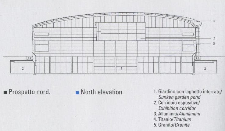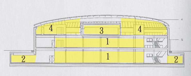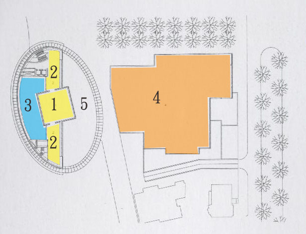 1.展示室(翼館) 2.展示走廊(翼館) 3.室內挑空(翼館) 4.展示室(主建築) 5.室外挑空