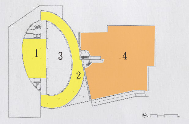 1.展示室(翼館) 2.展示走廊(翼館) 3.水池 4.展示室(主建築) |