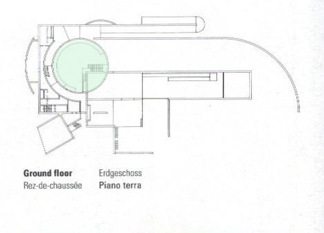 (1)圓形大梯置於後方,以圓形大廳作為各區的連接點,坡道沿著圓形大廳而下;空間的配置上,主要分為三個部分:畫廊展示區、卸貨工作區、辦公區。空間的處理上,強調水跟牆版的關係。水幕作為室內與戶外的中介點以及柔化空間。