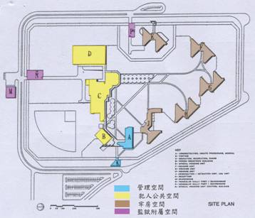 A.行政中心 B.會客區 C.教育娛樂中心 D.工場 E.特殊監獄單元 F.G.H.監獄單元 J.拘留所 K.接待區