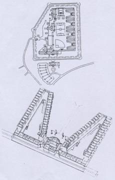 特色:通常是矩形的牢房建築平行配置,分為 1.