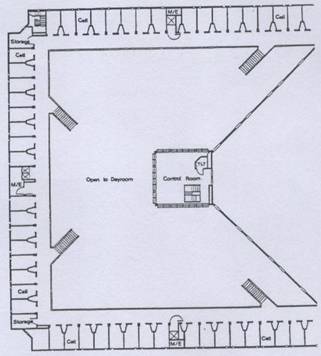 加州監獄的基本單元(1980s & 1990s) 控制單元位於二樓中心,可俯瞰監視各個牢房。 |