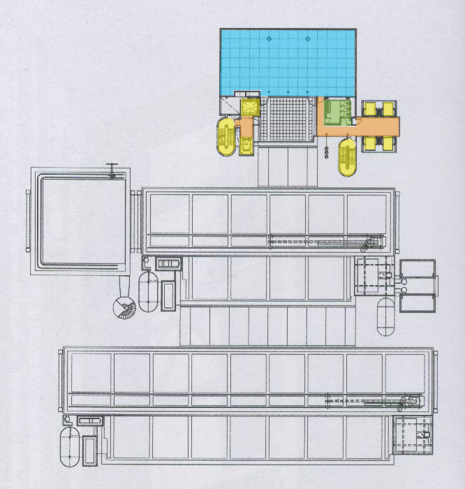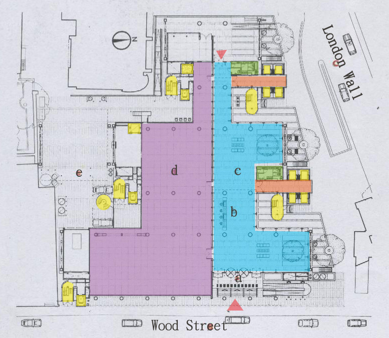 空間說明: a 入口 b 接待區 c 大廳 d 多功能使用空間 e 服務入口