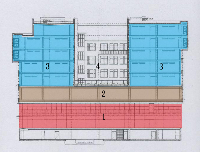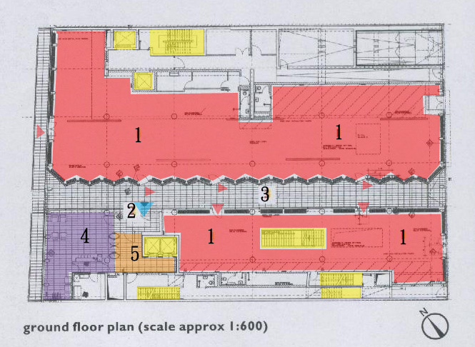 空間說明: 1. 商店 2. 辦公室入口 3. 徒步長廊 4. 辦公室大廳 5. 辦公室梯廳