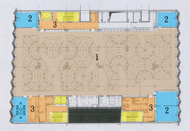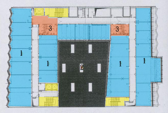 空間說明: 1. 辦公室 2. 中庭 3. 服務核
