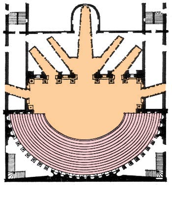 在此案例中的佈景是採用固定式場景,所以舞台上方並無設置升降布幕的空間