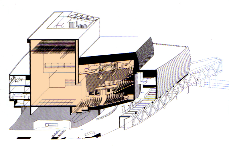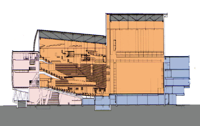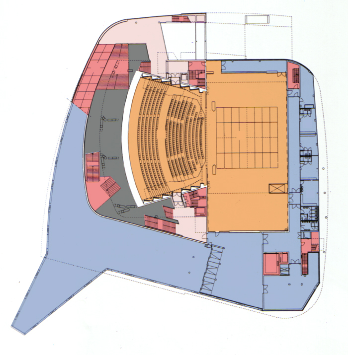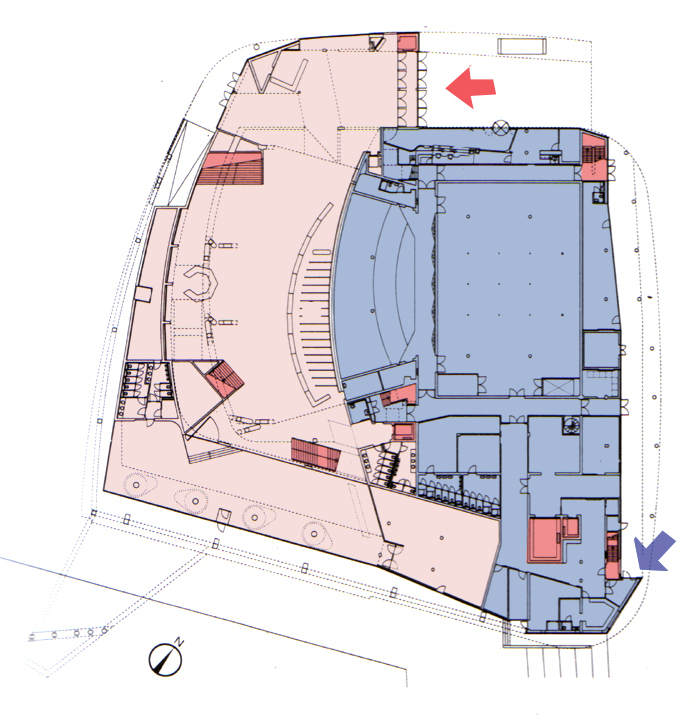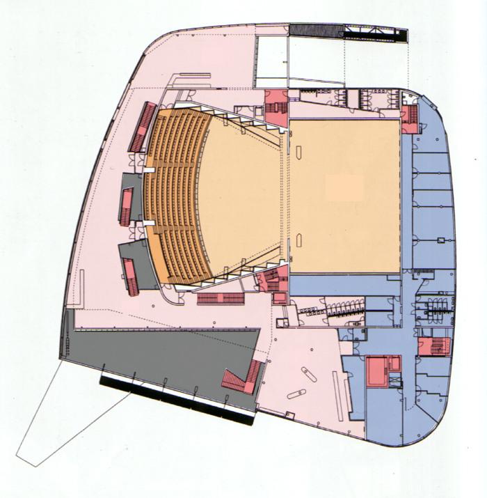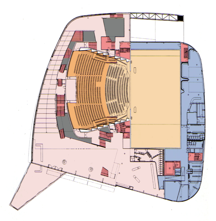 辦公室、後台、化妝準備間以及表演者的主要進出動線都位於建築物的東側 所有的觀眾休息區、bar、或咖啡廳都面向南側以為了眺望萊茵河港灣的景色 |
