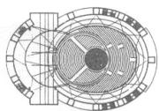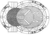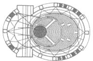 由附屬在卵形體其中一端的圓形空間自轉所創造出三種不同的劇場使用形式。