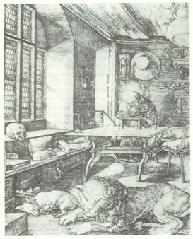 夾套釘在後牆上,夾套中還夾著一把削鉛筆的小刀與一把剪刀。這些物件的上方是一個燭臺架,幾串念珠與一根草製帽飾垂掛在鉤上;那個小碗櫥中可能裝有一些食物。壁龕中安置著盛滿聖水的聖水缽。從天花板上垂下來一個碩大無比的葫蘆,這是房中唯一一件純裝飾的物品。除了幾件富寓意的物品:一頂朝聖的帽子、一個頭蓋骨、一個砂漏之外,這房裡並沒有甚麼令我們稱奇之處;當然,在前景中躺著打盹的那頭被聖耶柔米馴服了的獅子自是另當別論。房內其他物件都是我們熟悉的;我們彷彿覺得自己可以輕鬆坐上那張空著的靠背椅,在這實用而不嚴苛的房間享受回到家中的親切感。在這幅作品中,杜勒以一種細膩入微的方式,刻劃出散置於這間零亂房間中的各件物品,透窗而入陽光不僅溫暖了伏案工作的老人,也將外在、自然的世界引入這間房的內在世界。