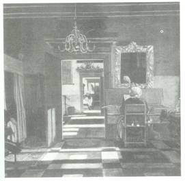幅平和的田園風情圖。從陽光射入的低角度,以及遠處門廊中僕婦忙著晨間雜活的身影判斷,當時應還是早晨。這家的女主人,除了這位少婦之外還能有誰?端坐小鍵琴前彈著。她彈著琴的這間房,是典型的多功能房間,除了那具小鍵琴之外,還有一張桌子、三把椅子與一張有帷幔的床。