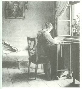 當我們欣賞克斯丁在一百四十年之後所繪的那幅女孩刺繡圖的畫作時,我們一眼就能查覺這是她的房間。擺在窗臺上的是她栽種的植物,放在長椅上的是她的吉她與樂譜,牆壁上那幅青年的畫像是她掛上去的,畫像上垂著的花飾也是她安裝的。這幅畫中洋溢的親密意識絕非憑空而致,它描繪的,是一個經過精心安排、做為個人遁世藏身之用的房間。 |
