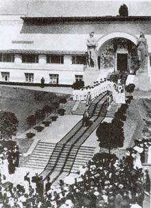 Olbrich¦b¶Â´Ë¨¹®iÄý·|〈Hessische Landesausstellung〉«Ø©óDermstadtªºº¿¸¦¨à±^〈Mathildenhöhe〉ªºµ²±B¬ö©À¶ðHochzeitsturm〈WeddingTower〉。 |