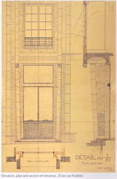在繪製3D圖的過程中,我對於這案子的所注意的是它的牆面裝飾(如右圖), Auguste Perret運用了向日葵作為建築物主要的外觀表現,使這棟公寓具有古典意味的外表形式,將採光井去掉,遮蔽樓梯的牆用玻璃磚建成,使光線可以全無阻攔的照進去;在立面的感覺上,亦有注重一些比例的關係(如右下圖),以及細部上的考量。(如下圖)