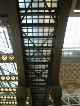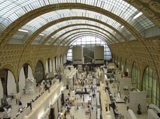 原有的鑄鐵結構(柱、樑、屋架、接合、鉸結點);用來被覆或裝飾鑄鐵的石材;纖維灰漿及裝飾;這些元素的存在條件限制了新建工程的範疇。而必須去考慮的重點必須著重於材料上的造型、尺寸、顏色和質感與原先的配合度而非本身藝術價值的問題。粗石面磚的大廳中軸線由鑄鐵拱架和頂部的大片採光玻璃,鑲嵌著纖維灰漿的裝飾面板,構成了壯麗的穹隆。由入口處向下走到原有的鐵道地坪(下降四米的高度),之後沿著緩坡爬升到正負零的地坪高度,四週環繞著厚實的隔牆,就像塞納河兩岸的堤牆,明確地界定了中央軸線的尺度,並引進入側翼的展覽空間,這些空間得以享用經過再一次控制的中央軸線的光線。所有的美術館空間由此縱向軸線而組織;35米高,140米長的軸線引導著參觀者,使參觀者能辨認方向,選擇參觀路線。橫向的空間由七個開間及兩幢底部閣樓形成一組序列;第四開間沒有中央隔牆,由於其華麗的穿透性,形成了類似十字形教堂平面的側翼。在靠近里耳街邊的二層樓空間重新組合成向中軸線開放的展覽室,同時產生穿透性朝向市區;此效果是原先本來沒有,因為之前的大廳建築與車站間是由不透明的帷幕牆所阻隔。前廳的七個圓頂上方加蓋了七個圓形的小展覽室。上層的展覽空間則加建於頂部的空間,原先僅作為遮掩對岸杜勒麗花園散步行人可能望見車站頂的視線。