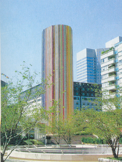 <<圖4-15/圖4-16 電梯機房上矗立著雕塑「夢遊者」,巨大的通風管化為彩虹圓柱,原本不甚美觀的固定設備,都被精心設計成公共藝術。
