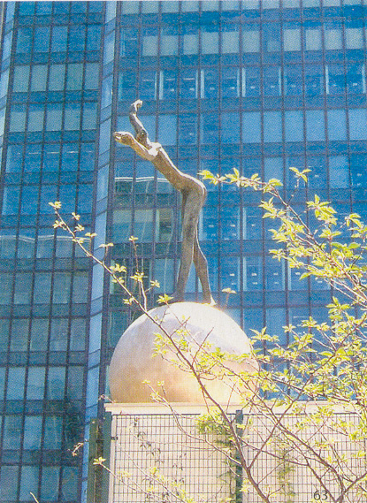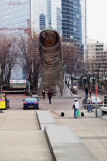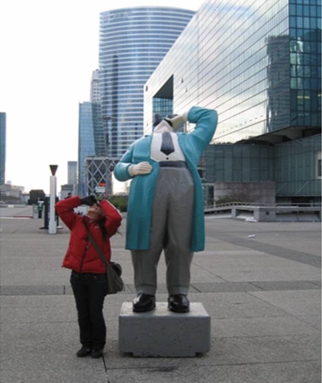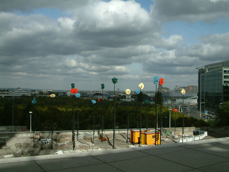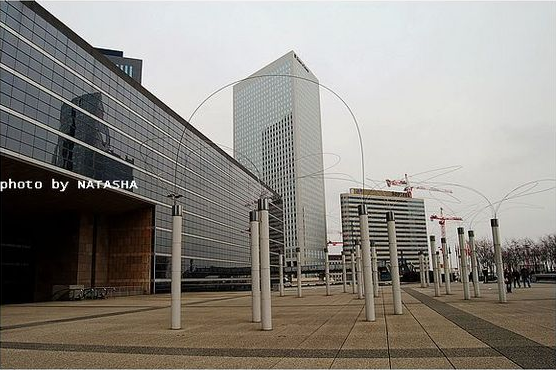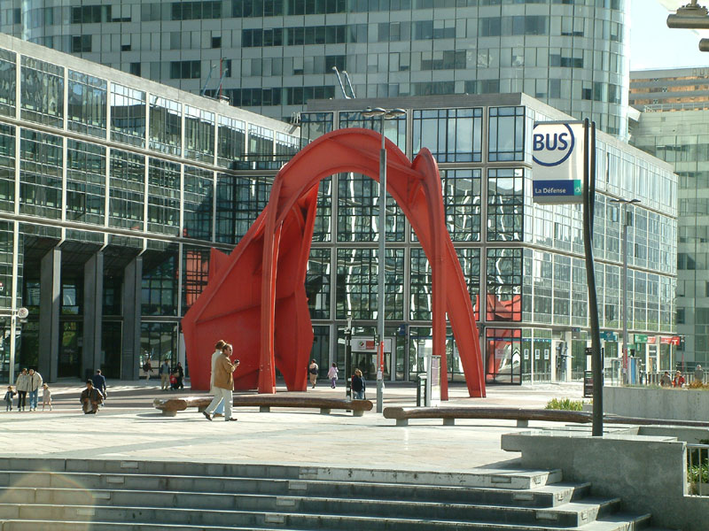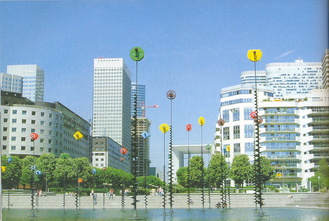 巴黎市中心搭乘地鐵前往拉德方斯,過了塞納河,列車即鑽出地面來到Esplanade車站,循著樓梯前往拉德方斯拱門,抵達架高的遼闊人工地盤之上,長約八百公尺,寬約七十公尺,約有六十幾座公共藝術,多數是邀請藝術根據環境特性量身設計,使得拉德方斯開放空間,就像是優美的雕塑公園。在地盤之下是複雜的停車場、車道及捷運系統,地盤上則不滿大大小小的廣場、綠地及水池,徹底的人車分離。因此周邊都是高聳的摩天大樓,卻完全沒有現代大都會的車流喧囂。