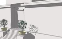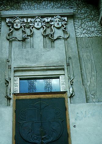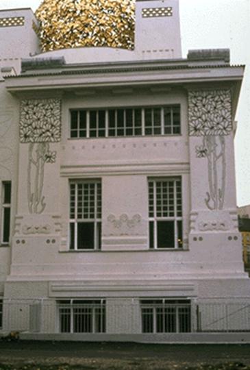 文字方塊: 外觀是一係列的立方體,剛性的立方體是主要的表達,Olbrich用一些柔和的線條和重疊量體跟一些簡單的壁柱來裝飾建築物的外觀。可以發現像柱子不像古典時期的柱子,也簡單許多,像直接在柱子上繪畫在古典時期是決對不會出現的。