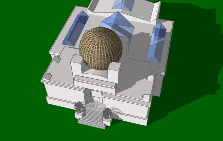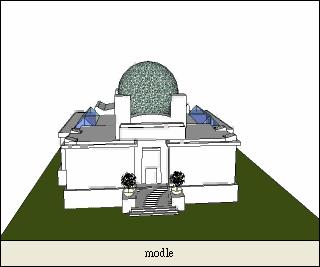 文字方塊: 藝術應該隨著時間不斷的更新與改變,而在四根柱上的金色葉子所形成的圓球,就是像徵古代由樹葉來覆蓋的屋子,屋子上的葉子是要不斷更新的,這是我從SESSSION這本書裡看到的話。