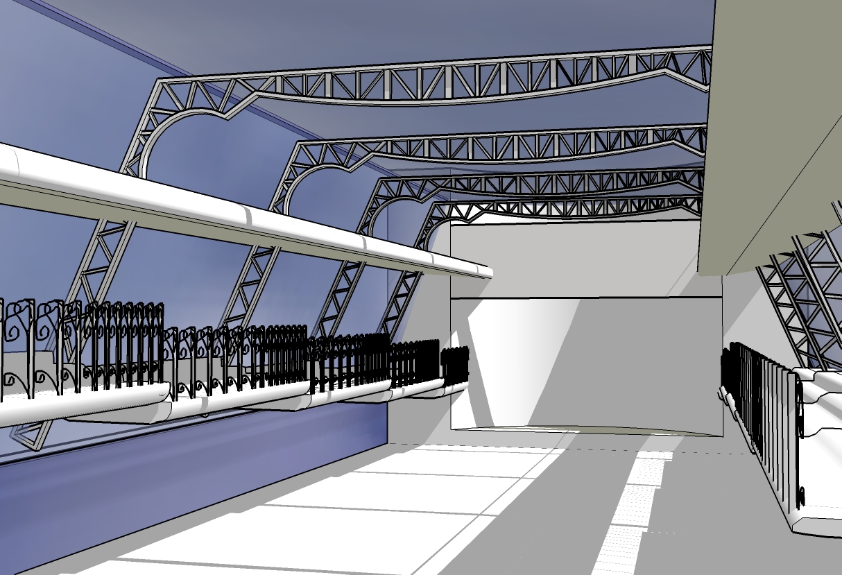 3D 建模 檔案下載區 (軟體:SketchUp 5.0) 繪圖心得: 建築師Horta善用金屬構件與玻璃以及比利時的當地磚石建造了La Maison du Peuple,在建築物的外觀上可以很清楚的看見他所提倡的「營造的技術、材料支配著建築物的造型。」藉由玻璃開窗和鑄鐵柱樑的結構系統特色,解決了內部集會空間的採光問題。用金屬建材作為直接的裝飾材料,在上面表現新藝術運動仿大自然植物莖脈的有機線條,使簡單的集會空間的裝飾變的簡潔大方、明亮。 因為屋頂的集會大禮堂是我覺得在La Maison du Peuple中最有趣的空間,所以把它獨立出來,畫了一張簡單的內部透視圖。