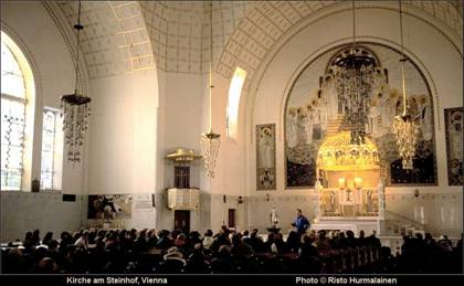 表現手法: 一.教堂外部則鑲大理石,且以釘頭裝飾,螺旋狀的花冠石柱支撐著大門. 而在外牆上的四座大圓石柱,則是由辛科維茲(Schimkowitz)製作的天使像盤據其上. 兩邊角落則各有一尊路克斯(Luksch)所製作的雕像,左邊是聖利歐波德(St Leopold), 右邊是聖塞維林(St Severin),雕像底下的座椅則為霍夫曼(Hoffmann)的作品. 二.教堂內部則以金與白兩色橫飾帶為主. 莫澤設計的藍玻璃窗,當白晝的陽光從外頭透進來時,會產生一種瑰麗奇異的光影效果. |