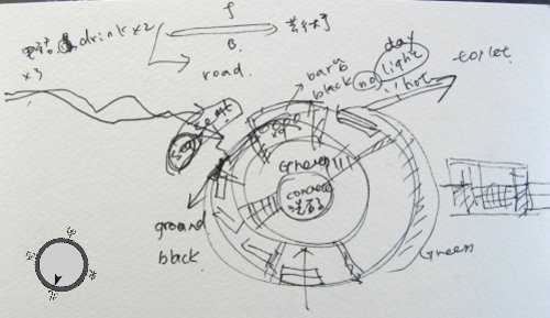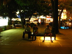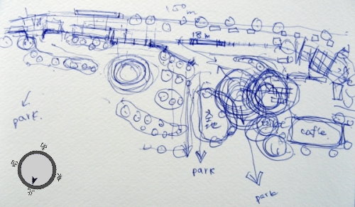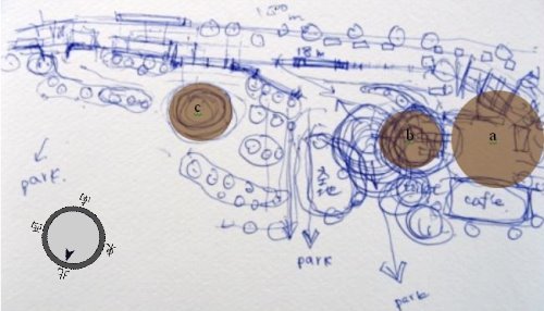 →廣場b. a. 面向表演場地 b. 面向廣場內,多事情人聊天區 c. 光椅區,大多朋友會在這裡聊天 d. 因為後面是植物區,所以聊天的隱私高於c.