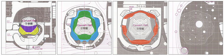 圖13:衛武營藝術文化中心音樂廳空間及各層座位示意圖(左到右:0m-4m-10m-15m)