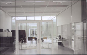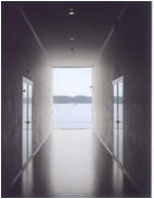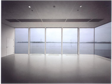 面臨海灣側,玻璃外牆的做法達到與海相當接近的視覺感受 -室內的演練空間使用大量的玻璃外,天井的採 -天花板採用沖孔板,也將