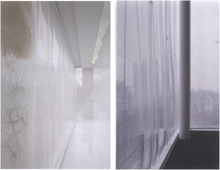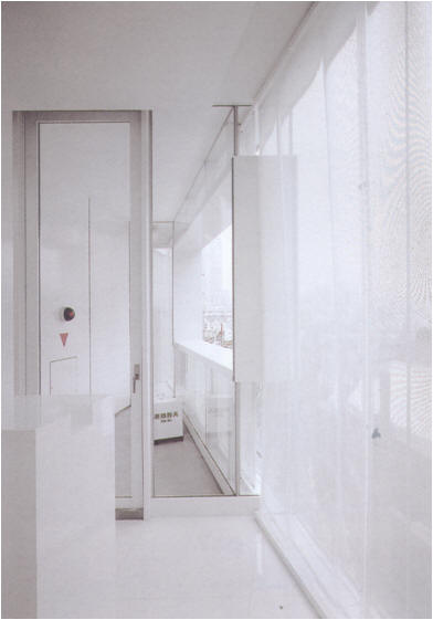 玻璃背擋以間距放置,玻璃檻在上下部之框架,讓空間更加乾淨,讓人在室內感受不到玻璃的存在,只有半透明的帷幕系統!