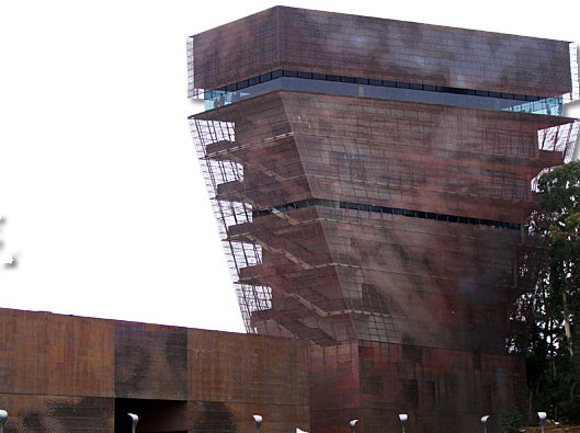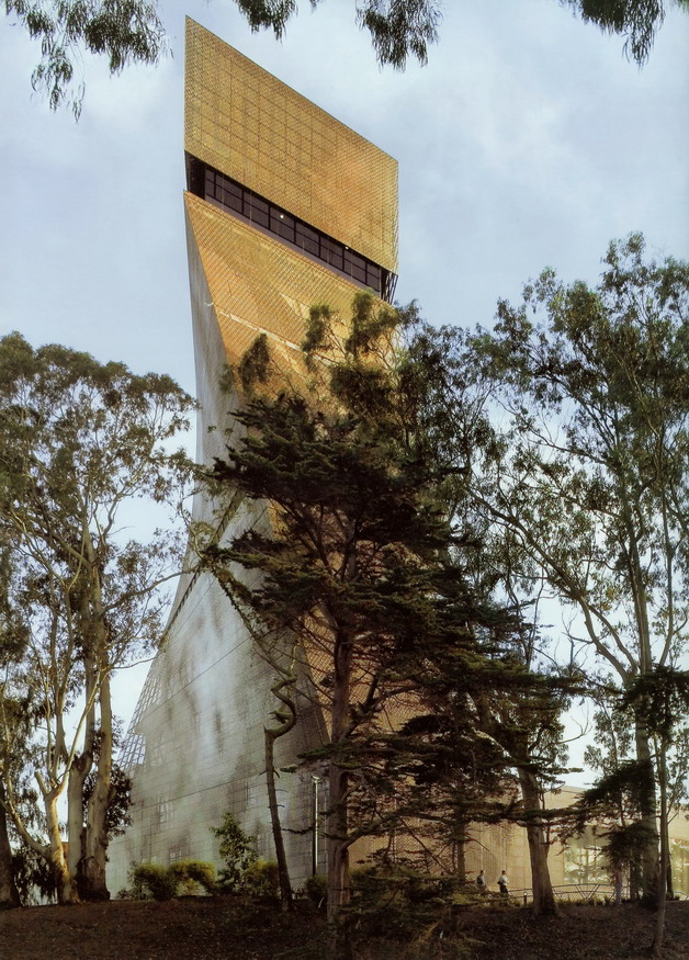 de Young觀景台如同舊金山公園週遭地區的地標, 從屋頂層的正矩形螺旋性的向上發展成為一平行四邊形,