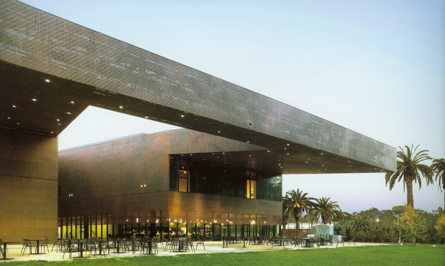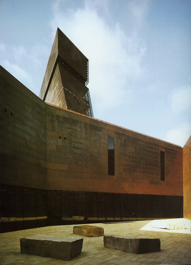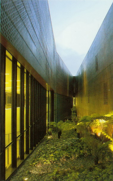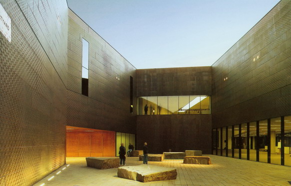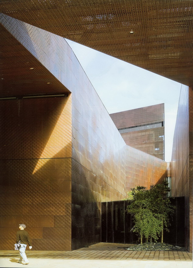 在經歷時間的洗鍊及季節的變遷後, 原夲輕質光亮的金屬表皮已轉變為後重的地域色彩, 宛如由地面隆起的岩石, 於建築體併裂出三處的中庭延伸至戶外的公園,