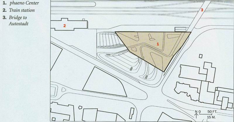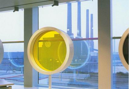 ↑遍及建築中,提供一個不變的視野在提醒著沃夫茲堡獨一無二的背景 ,對沃夫茲堡(福斯汽車的生產基地)來說,新落成的科學中心有著重要的象徵功能。當本市從製造導向的工業城轉型成為一個以知識為基礎的科技重鎮時,斐諾科學中心透過其自身的機能與建築彰顯沃夫茲堡的研發文化,儼如本地的市招。