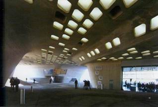 自建築物前方寬廣的開放空間,景觀經由似平坦的山谷與退縮漸漸地帶領著參訪者至位於建築物下方的空間,而在任何一個方向也都可以發覺這景觀是由圓錐體所構成,而它與在地面層景觀所感受到的輕鬆及緩和是不同的感覺,雖然複雜但卻是極吸引人的