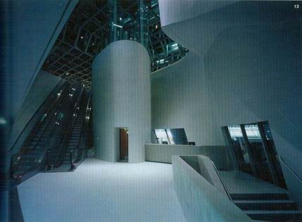 一個令人感到驚訝的建築空間體驗時刻開始於當參訪者自戶外經過主要入口之玻璃門進入「入口圓錐體』。在這圓錐體的內部直接開放至整個如在空中旋轉的量體•在外部經由採用未經修飾的混凝土使人聯想到的沉重與粗糙感,但是在圓錐體內部的牆面卻被處理成強烈對比明亮的白色,其他還包括了玻璃與鋼材所構成的電扶梯及位於更上方由鋼樑所構築而成的天花板