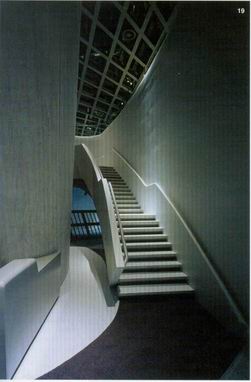 帶領著參訪者至位於建築物下方的空間,且漸漸地可以感受到都市景觀與建築景觀兩者則在此合而為一體