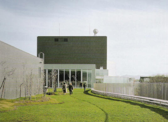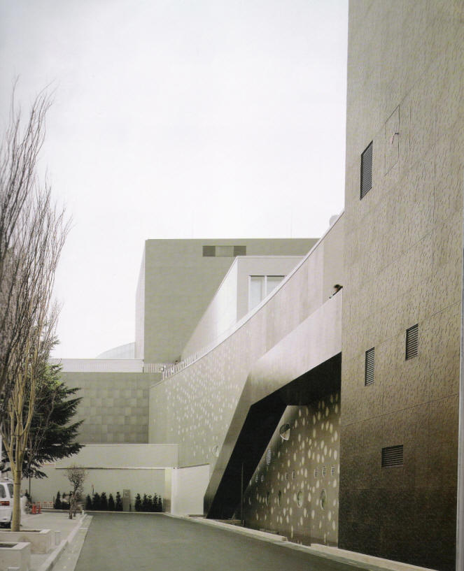 從大廳入口看來,不覺基地狹長. 從停車場看工作室入口,立面造型豐富.