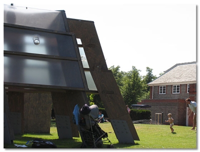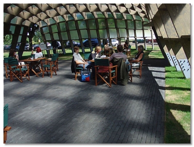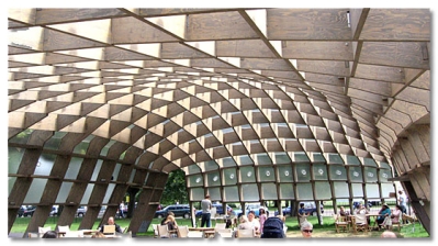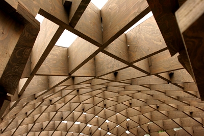 我想第一次看見這個亭子的震撼是相當大的,很難想像如此簡單的手法呈現出的視覺效果會如此強烈。木材的質感和形狀,做了某種程度的扭曲之後,造成有如外星生物四肢般的站立在地面上,卻不會感到突兀。而其中形成的光影效果,以及人與自然間的互動關係更是讓人驚嘆。