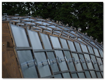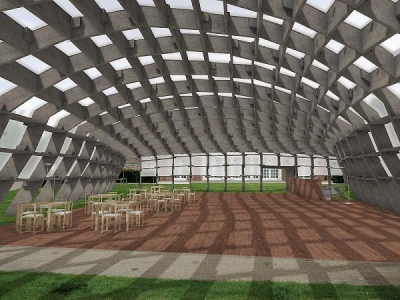 人們所能見到的只是木材搭建而成的格柵,以自由而抽象的弧度延伸,包覆在這片草坪上。半透明的板材提供了柔和的光線來源,包裹的程度足以提供建築應有的遮蔽,卻不至於阻擋了自然風在其中的穿梭。