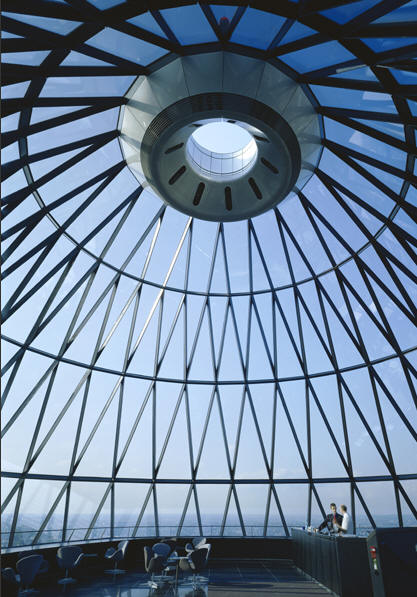 創造各層連續地板。因樓板位置不同使空氣自然流動。每六層樓規劃空調及防火安全區域創造出內部庭園。建築物表面由雙層低反光玻璃作外牆,減少陽光造成建築物過熱,建築物內部有六個三角形天井,讓自然光的射入,達到採光的效果,因為建築物為螺旋型,所以光線並非直接照射,光線則是則照在建築物表面上,具有散熱的功能。玻璃牆面有三角形的小洞,主要功能為緩衝機械熱化和冷卻所需要,也是辦公室廢氣轉換。 建築物每層的直徑隨曲度而改變,直徑由162尺至185尺(17樓),之後續漸收窄。建築物外部空氣自然帶動,達到建築物外殼散熱的功能。