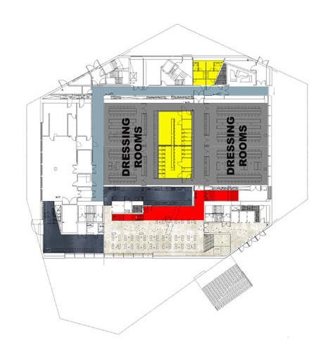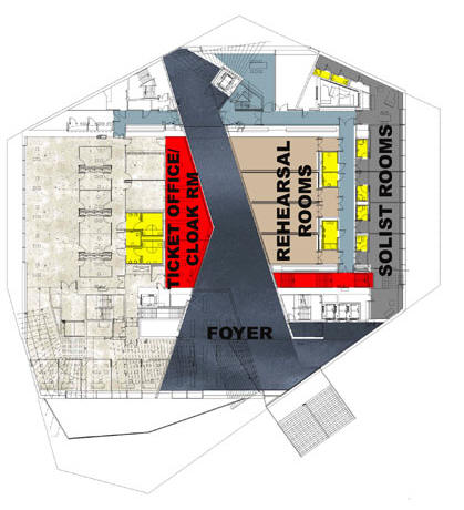 本建築物替波多交響樂團設立許多排練室,、獨奏聽與更衣室,也對外邀請的表演者提供而外設施。