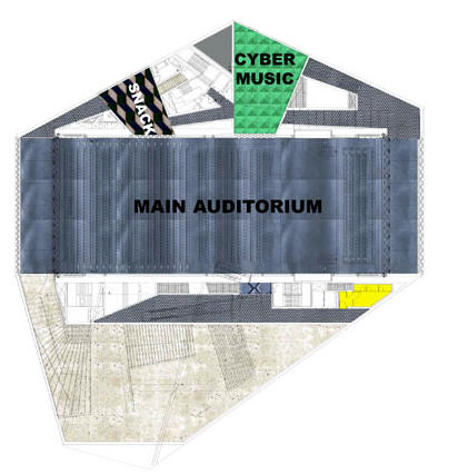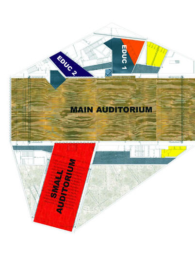 本建築物以不同方式將內部呈現,在建築物內部也可體驗外面的城市風貌,界於外部公共設之間的剩餘空間規劃成次要的服務設施例如:門廳、餐廳、露台、技術室與垂直運輸設備。