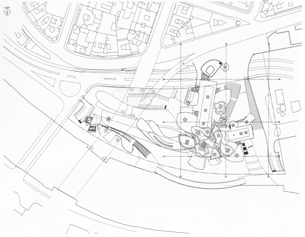 基地位址: 位於商業區與(NERVION)河南岸倉庫區,並經過於本市的古蹟區,因此本博物館將成為貝拉藝術博物館/大學/舊市政廳所形成三角區域的中心.此外再連結19世紀市中心與東邊偏遠地區的梭飛僑越過於本基地的東邊角落,將成為”城市的入口”意象 在博物館的入口處有一公眾廣場,主要是用來疏解新博物館與貝拉藝術館及老城市與河流之間的行人交通.公眾的設施,諸如一個300座位的音樂廳,一家餐廳及一家零售店,每一家均可從主要入口區到達目的,因此可以使這些空間在博物館開放的時間內可以獨立運作,使它可以成為畢爾包都市生活不可或缺的部份 |