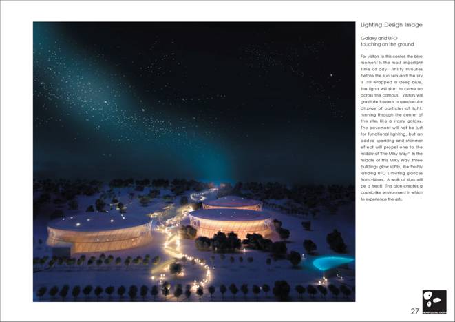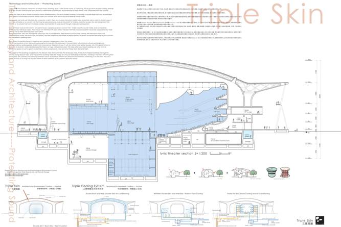衛武營都會公園是一個綠意盎然及市民休閒及體驗熱情的絕佳場所。沿著高速公路的公園西側配置停車場與綠地,東側則是配置休閒商業區及社區藝術工作室,其間即為藝術文化中心的主場地,將不僅給高雄的人們帶來生活上的樂趣,也將引起觀光客的興趣。茂密的綠帶可有效串連南邊的運動公園與校區及和北邊的中正公園。人們可在這綠意盎然的公園裡,無拘無束的自由通行。在樹間交錯的景觀步道間,國家藝術中心即散佈其中。鼓:三層表皮技術與建築—保持純淨音質高雄舊稱「打鼓」。採用鼓形也是來自於「打鼓」 的發想,模擬古代祭典裡使用的銅鼓做出的巨大鼓形建築,內部將形成與外部世界隔絕的巨大空間。鼓利用內部空氣來傳遞聲音及確保音質的純淨。有了鋼筋混凝土建造的雙層屋頂與雙層外牆的鼓形建築,因為有隔音的機能,將可確保室內空間的寧靜。歌劇廳、中劇場、音樂廳這三種發出美麗聲音的「樂器」,為不互相干擾,每個樂器將擁有自己的盒子。隔音的最好方法是以三層表皮分隔,以及拉開各廳院的距離。除演奏廳的分離外,仍有許多的設施可共用以達到空間最大的使用效益。如:排練室、事務室、餐廳、圖書館,及集宴會、試演會、招待會多功能的宴會廳等,三館都得以共享資源。