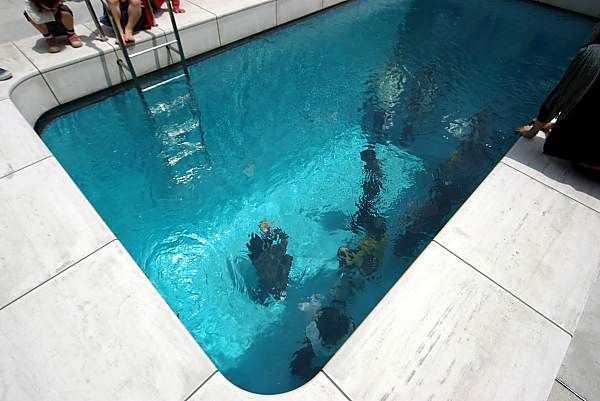 池中泳客不著泳衣,卻穿便服,事實上泳客就是遊客;而泳池雖無法游泳,卻是藝術作品也是建築中庭的一部分。