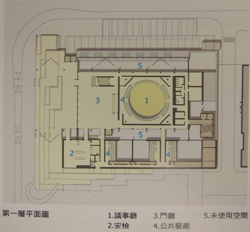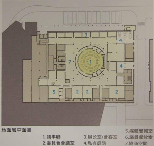 屋頂與底座是兩個決定性的平行元素,區劃出本案基地與鄰近建築的關係。波浪屋頂定義建築內部,在水面上的底座則定義開放空間,兩者以簡潔的線條呈現心國民議會的意象,除了議事功能以外,本建築也提供展覽與教育功能,以及咖啡座、媒體中心與議員辦公室等設施以滿足各種不同需求。