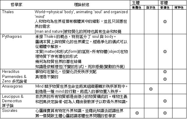 蘇格拉底前學者與蘇格拉底理論比較表: