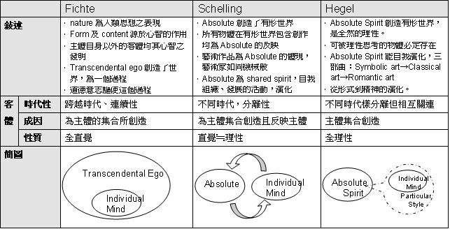 費希特 (J.G.Fichte) 、謝林 (F.W.J. von Schelling) 、黑格爾 (G.F.W.Hegel) 主張異同表: