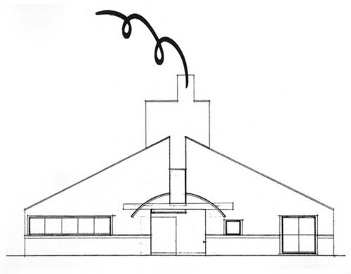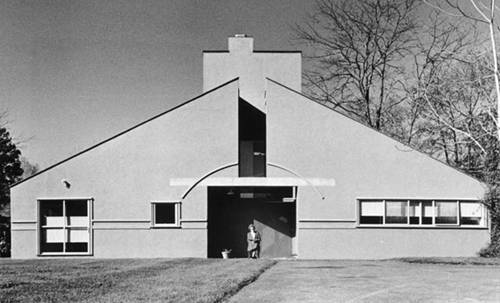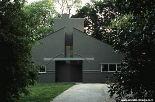 其矛盾,在於對稱立面上的詭異變調。強調對稱軸線的細部有圓拱(線腳而已並且斷了)、橫樑(硬嵌進去的)和方門洞(裏面的牆一半是斜的,門歪在一側,從正面看不見,只有歪著的門燈露出來),還有軸線上一道深深裂隙。緊貼軸線後部,有工作室和壁爐上方的煙道高起,略微偏斜,把立面的表情拉成斜眉耷眼。右邊是以五個窗口正方形組成。但左邊的則是一個小視窗和由四個方形所結合成的大視窗,雖然在面積比例上是相同的但是分割的方式卻是完全不同,用行話講,這就叫“平衡而不對稱”。